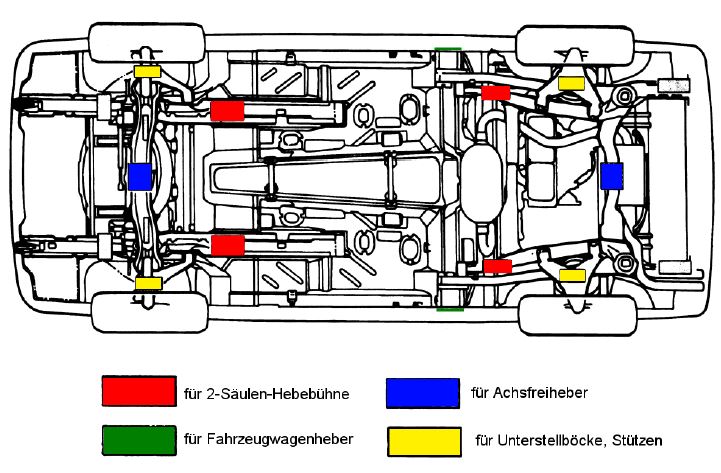 Die Anhebestellen für den Fahrzeugwagenheber (grün) nicht für andere Wagenheber verwenden.