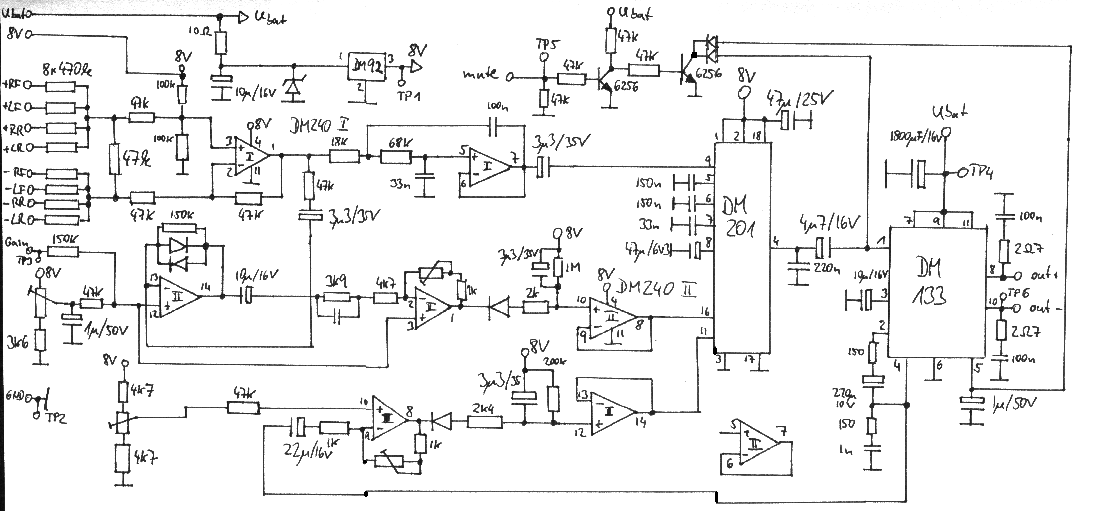 Wenn noch immer alles stumm ist, der DM240 Operationsverstärker kann durch einen LM324, und der DM92 Spannungsregler kann durch einen LM7808 ersetzt werden. Für den DM201 kenne ich leider keinen Ersatztyp, für sachdienliche Hinweise bin ich dankbar!